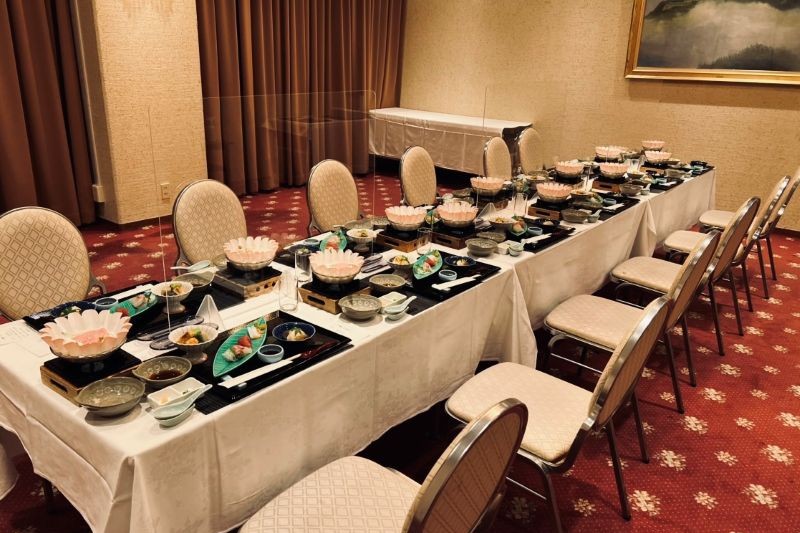 ご夕食の御席では、ホテル自慢の四季折々の旬を味わう会席料理や、皆様で囲めるお鍋をお選びいただけるほか、お食事に合わせて飲み放題も承ります。