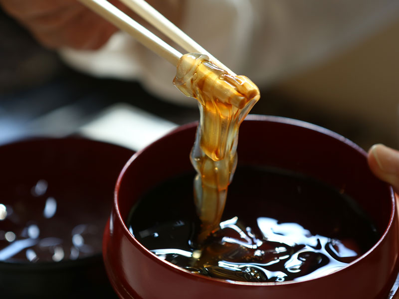 昭和46(1971)年創業、看板メニューのくずきりは、信玄弁当の形にヒントを得て考案したという二段重ねの漆塗りの器に盛られています。黒蜜にくぐらせてつるんといただきます。 【場所】鎌倉市佐助2-6-1 【お問い合わせ】0467-22-0341