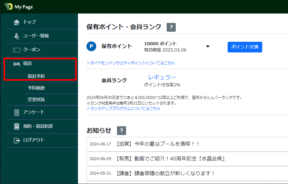 メインメニューの宿泊予約から、ご予約に進んでください。