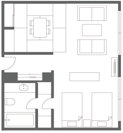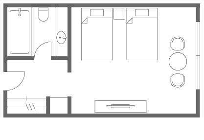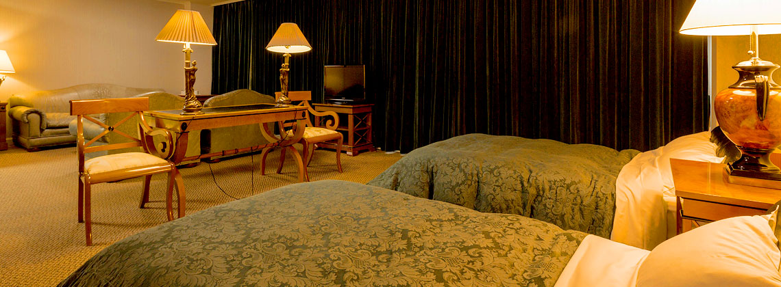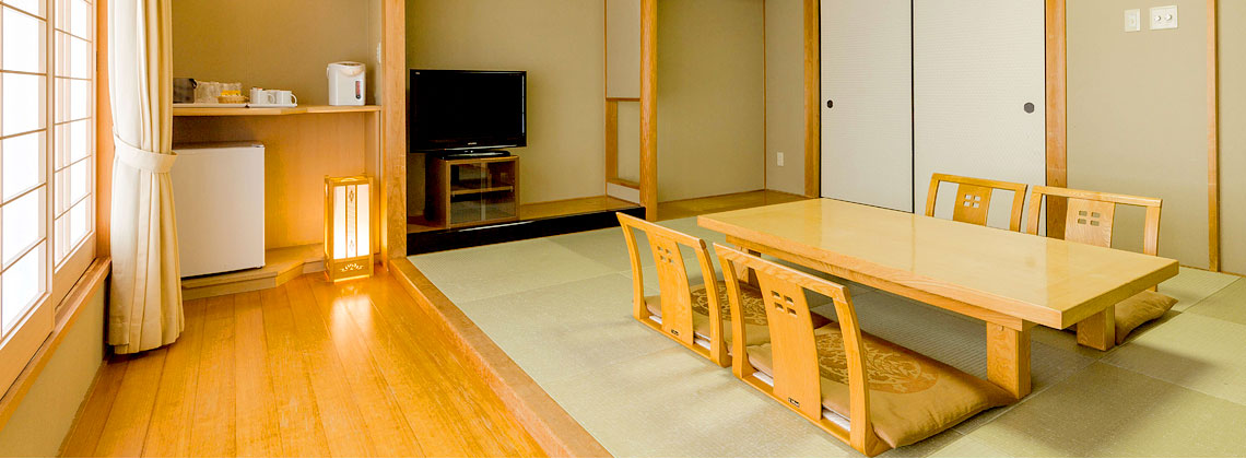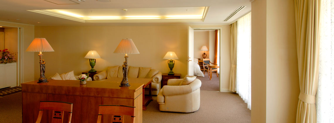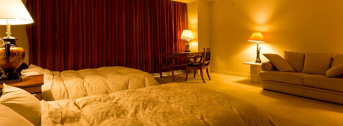 デラックス同様、和洋折衷タイプのお部屋ですが、ツインルームが扉を挟んで別室になっており、全体的に広いスペースが特徴です。