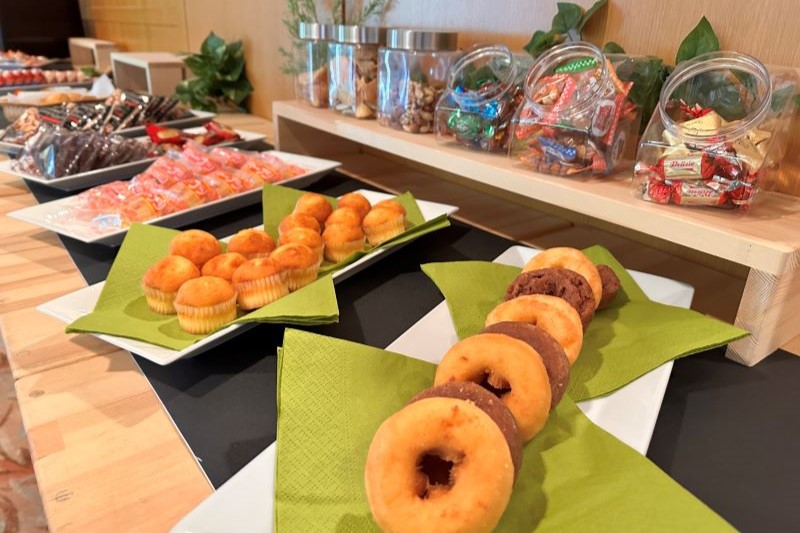コーヒーや紅茶とあわせて、ミニケーキや、信州りんご饅頭やみすず飴などのご当地スイーツが並び、おやつ休憩にぴったりです。