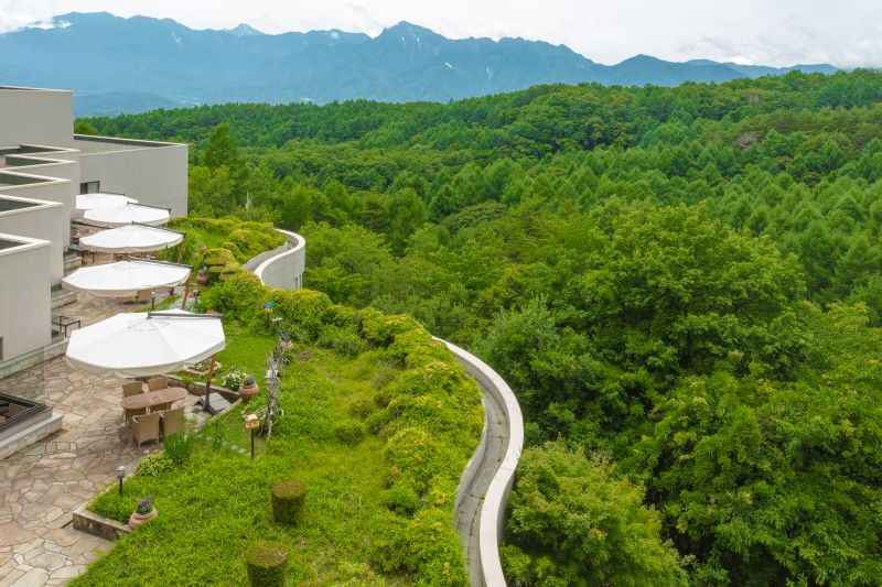 中空より八ケ岳の山並みを見下ろし、遠くには南アルプスの山々を望む絶好のロケーション。